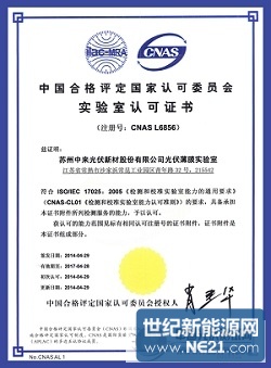 世紀新能源網消息:繼2013年5月10日通過德國TUV NORD實驗室認可后,蘇州中來光伏新材股份有限公司光伏薄膜實驗室(以下簡稱“實驗室”)于2014年4月29日又順利通過了中國合格評定國家認可委員會(CNAS)的正式認證,成為國內光伏背板材料領域第一家獲得CNAS認可資質的實驗室。由此,實驗室在認可范圍內所簽發的檢測報告,獲準使用CNAS標識和ILAC-MRA國際互認聯合標識,檢測結果專業權威、國際互認。